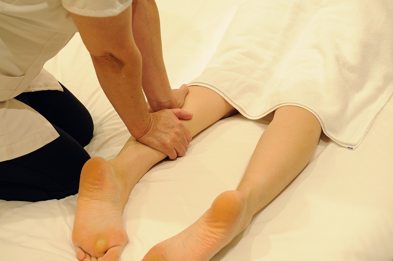 うつ伏せで太もも裏からふくらはぎ、足先までほぐした後、仰向けで足ウラ、すね、ふくらはぎ、太ももまで足全体をほぐします。